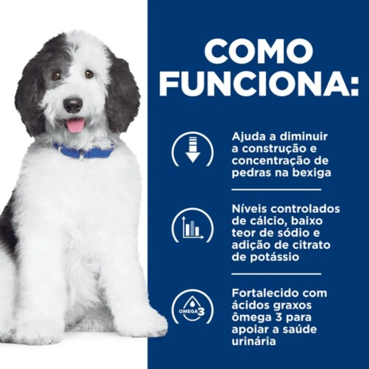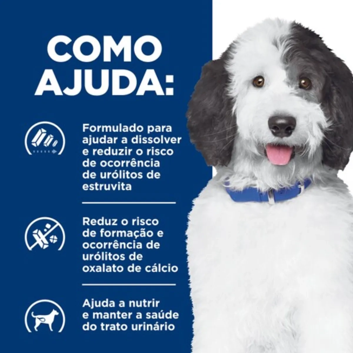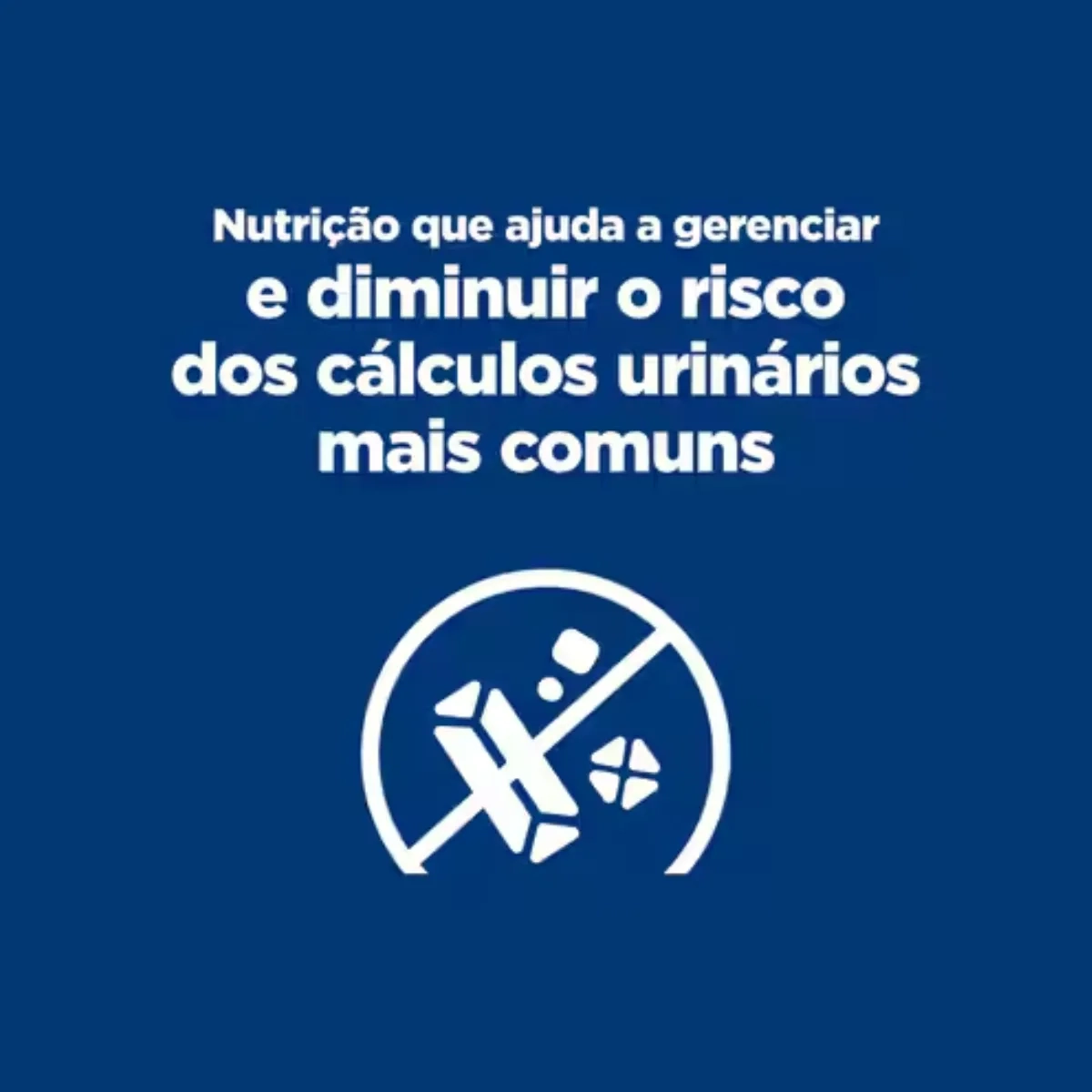 Os cálculos (pedras) urinários são coleções de cristais minerais que se combinam no trato urinário. Eles podem causar desconforto e levar a problemas mais sérios que exigem cuidados de um veterinário. Os nutricionistas e veterinários da Hill's desenvolveram o alimento Prescription Diet c/d Multicare especialmente formulado para apoiar a saúde urinária do seu cão e reduzir o risco de pedras de estruvita e oxalato de cálcio. Este irresistível alimento tem saborosos pedaços ao molho e é feito com ingredientes saudáveis, como frango e vegetais, que seu cão vai adorar.