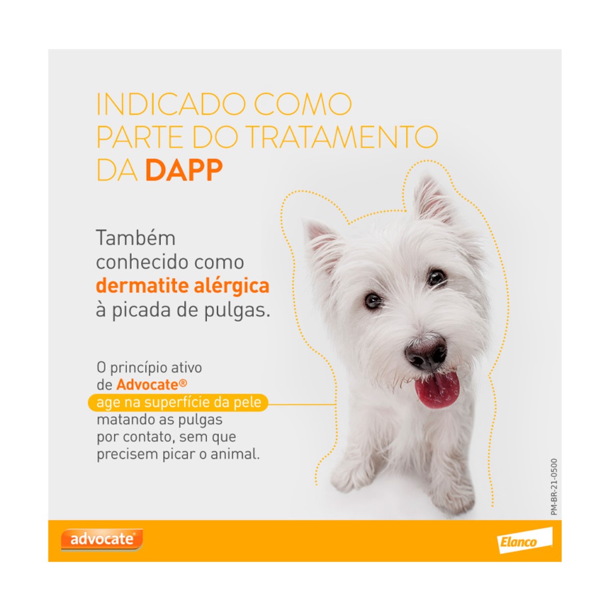 Advocate™ também é indicado como parte do tratamento da DAPP – dermatite alérgica à picada de pulga. A molécula antipulga age na superfície da pele, matando as pulgas por contato, sem que elas precisem picar o animal.
