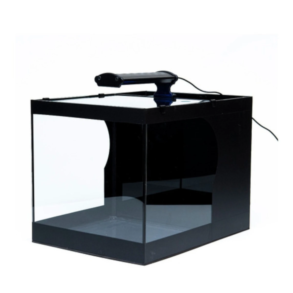 Composição: Aquário de vidro 3mm, Silicone atóxico preto, EVA, Papel vinil Gold preto fosco,
