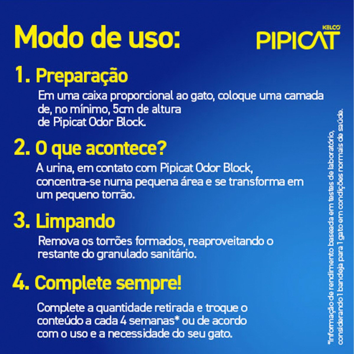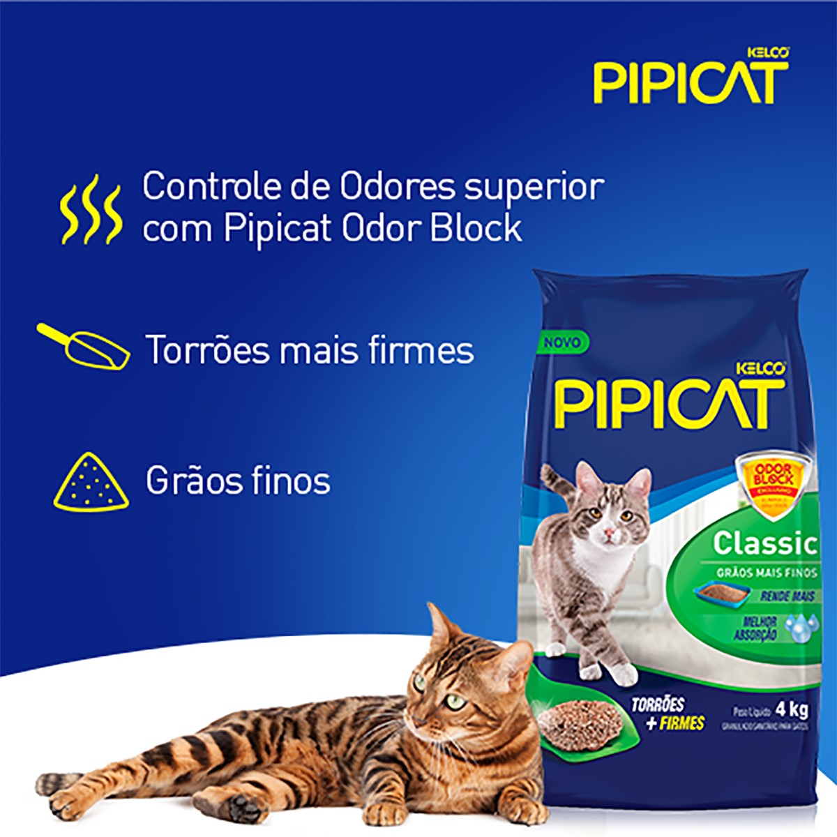Pipicat Classic possui controle de odores superior com a exclusiva tecnologia Pipicat Odor Block, que inibe a formação de amônia, prevenindo o mau odor na bandeja do felino. Com grãos finos e de boa absorção Pipicat Classic forma torrões mais firmes, que facilitam a limpeza diária. Com cheiro e cor natural de terra que atraem o instinto do seu animal, não possui fragrância .