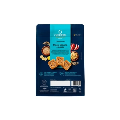 Farinha de trigo, arroz quebrado, fibra de trigo, trigo integral, aveia, banana desidratada, maçã desidratada, farinha víscera de aves, óleo de aves, aditivo palatabilizante , sacarose, farinha de algas schizochytrium sp., extrato de levedura, prebiótico (parede celular de levedura), extrato de yucca (0,04%), hexametafosfato de sódio (0,1%), sulfato de condroitina (0,01%), propionato de cálcio, cloreto de sódio, bicarbonato de sódio, bha, bht.
