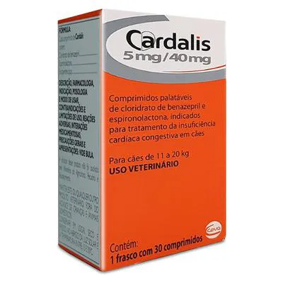 Cardalis Ceva 30 Comprimidos para Cães é uma combinação do vasodilatador benazepril (IECA) com o diurético espironolactona, que juntos promovem o bloqueio completo do sistema renina-angiotensina-aldosterona (SRAA), atuando como parte da terapia padrão de insuficiência cardíaca congestiva (ICC), assim que surjam sinais clínicos (tais como intolerância ao exercício, tosse e/ou dispneia; estágio II da Insuficiência Cardíaca Congestiva e estágio B2 avançado da ACVIM)*.