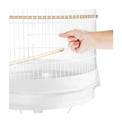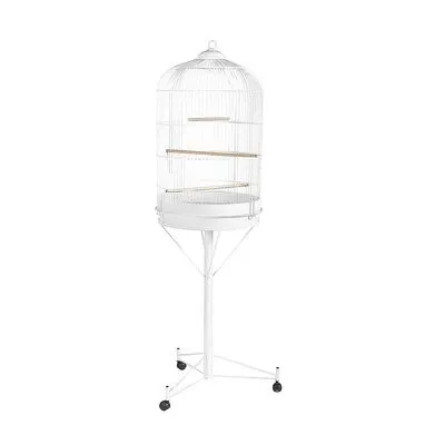 Arame, chapa, poleiro de madeira, pedestal de tubo com rodízio de plástico