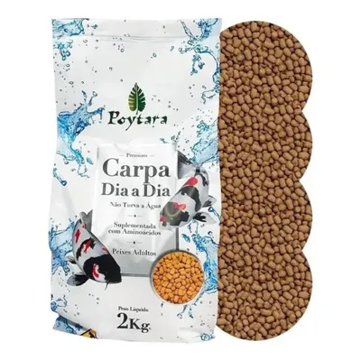 Poytara Carpa Dia a Dia é um alimento completo, formulado para a manutenção diária de carpas adultas e peixes de lago que, devido à estrutura do sistema digestório, têm mais aptidão para metabolizar principalmente carboidratos. Este alimento possui formato de sticks flutuantes, com aproximadamente 12 mm de comprimento e 5 mm de diâmetro, formulado à base de ingredientes de alto valor biológico e alta digestibilidade. Seu nível proteico é ajustado para atender à exigência nutricional de carpas adultas. Sua formulação garante que todas as exigências em aminoácidos para o completo bem-estar e desenvolvimento dos peixes nesta fase sejam atingidas plenamente. Além disso é enriquecida com probiótico e prebiótico, que estimula o crescimento e as atividades das bactérias benéficas no trato digestivo, e beta-glucano e vitamina C que auxiliam no funcionamento do sistema imunológico do organismo.