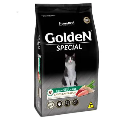 GoldeN Special Gatos Castrados Sabor Frango e Carne é um alimento completo, balanceado e rico em nutrientes, indicado para gatos castrados a partir dos 6 meses de idade e contraindicado para filhotes de idade inferior a 6 meses, fêmeas gestantes e lactantes, devido ao seu reduzido teor calórico.