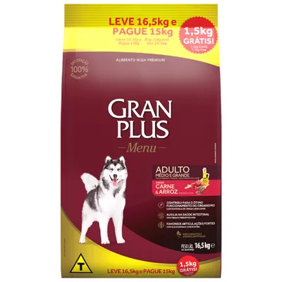 Ração Gran PLus Menu para Cão Adulto Médio e Grande Sabor Carne & Arroz 15kg + 1,5kg Grátis