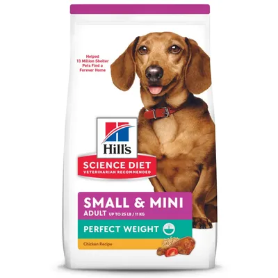 A ração super premium seca para cães Hill's Science Diet Perfect Weight Small & Mini é um alimento completo indicado para a perda e manutenção de peso de cães adultos de raças pequenas e mini até 11 kg.