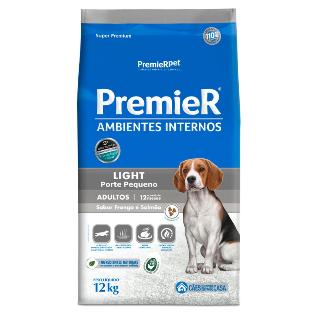 Ração PremieR Ambientes Internos Cães Adultos Porte Pequeno Sabor Frango e Salmão Light 12Kg