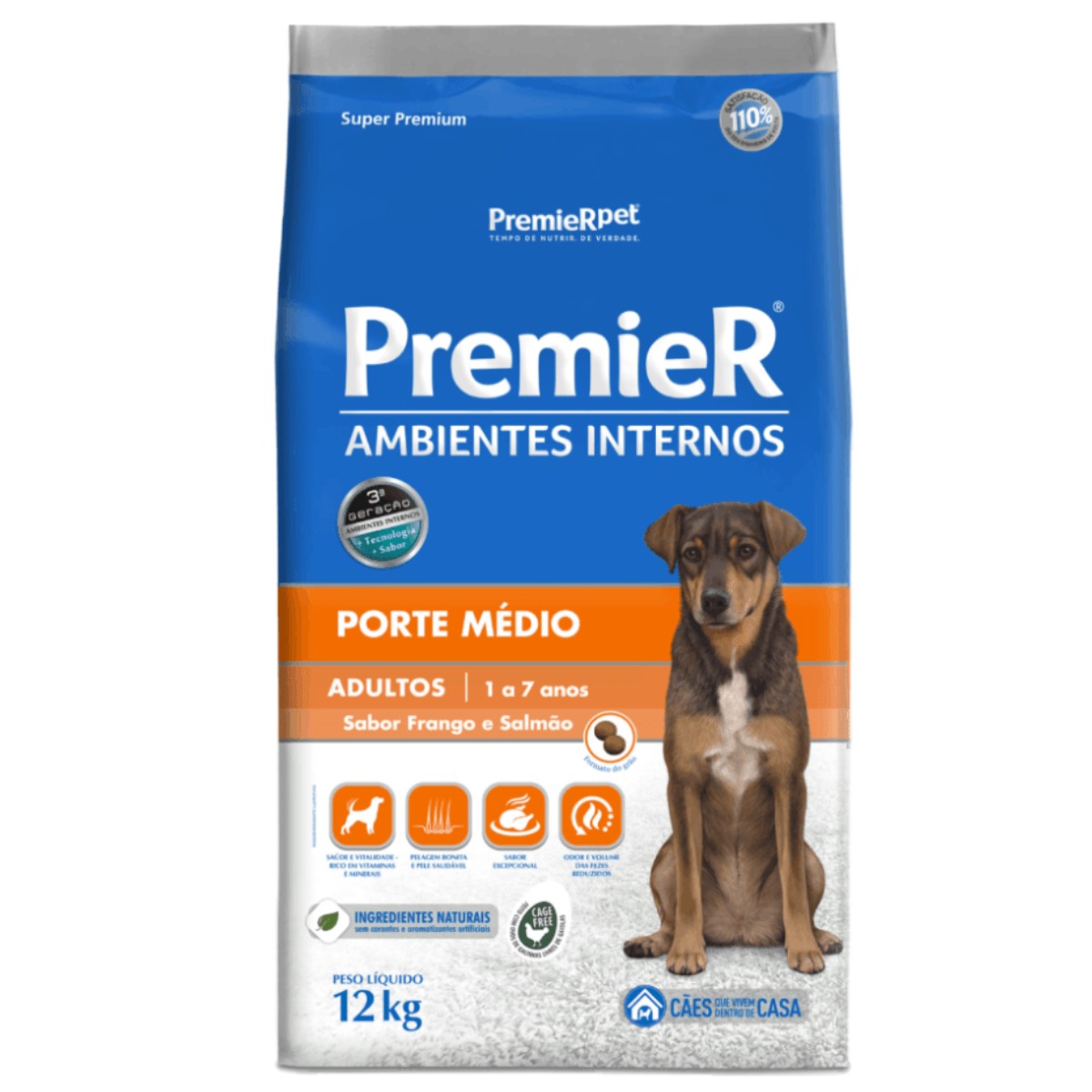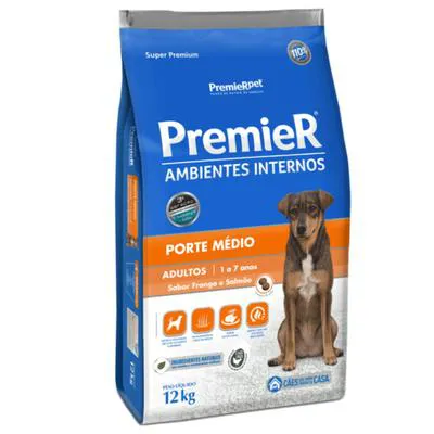 Ração Premier Ambientes Internos para Cães Adultos de Médio Porte Sabor Frango e Salmão 12Kg