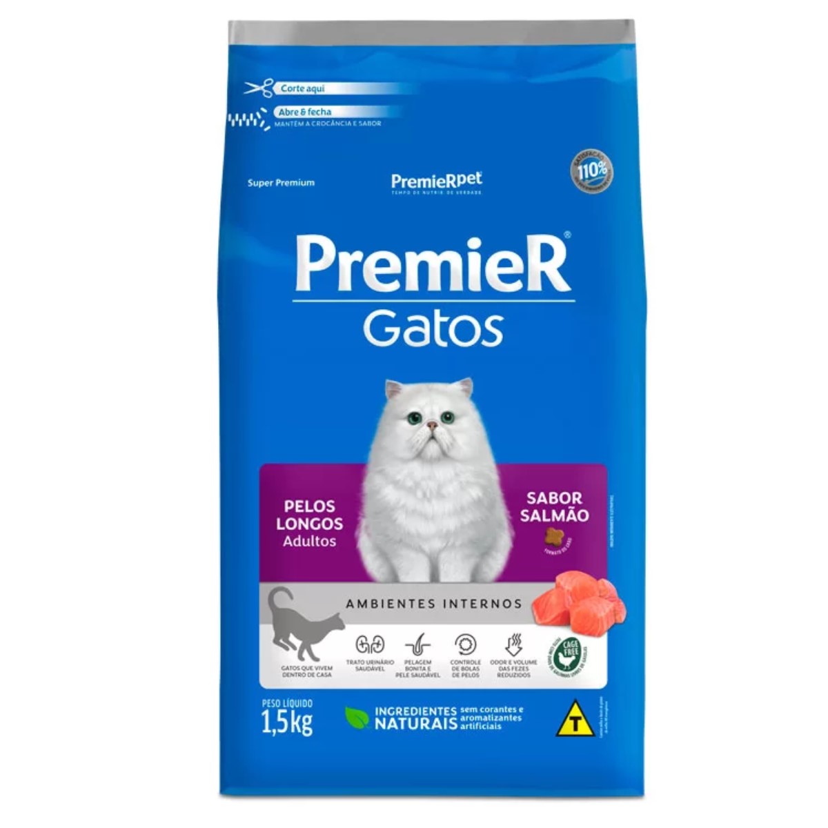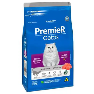 Ração PremieR Ambientes Internos para Gatos Pelos Longos Adultos Sabor Salmão 1,5Kg