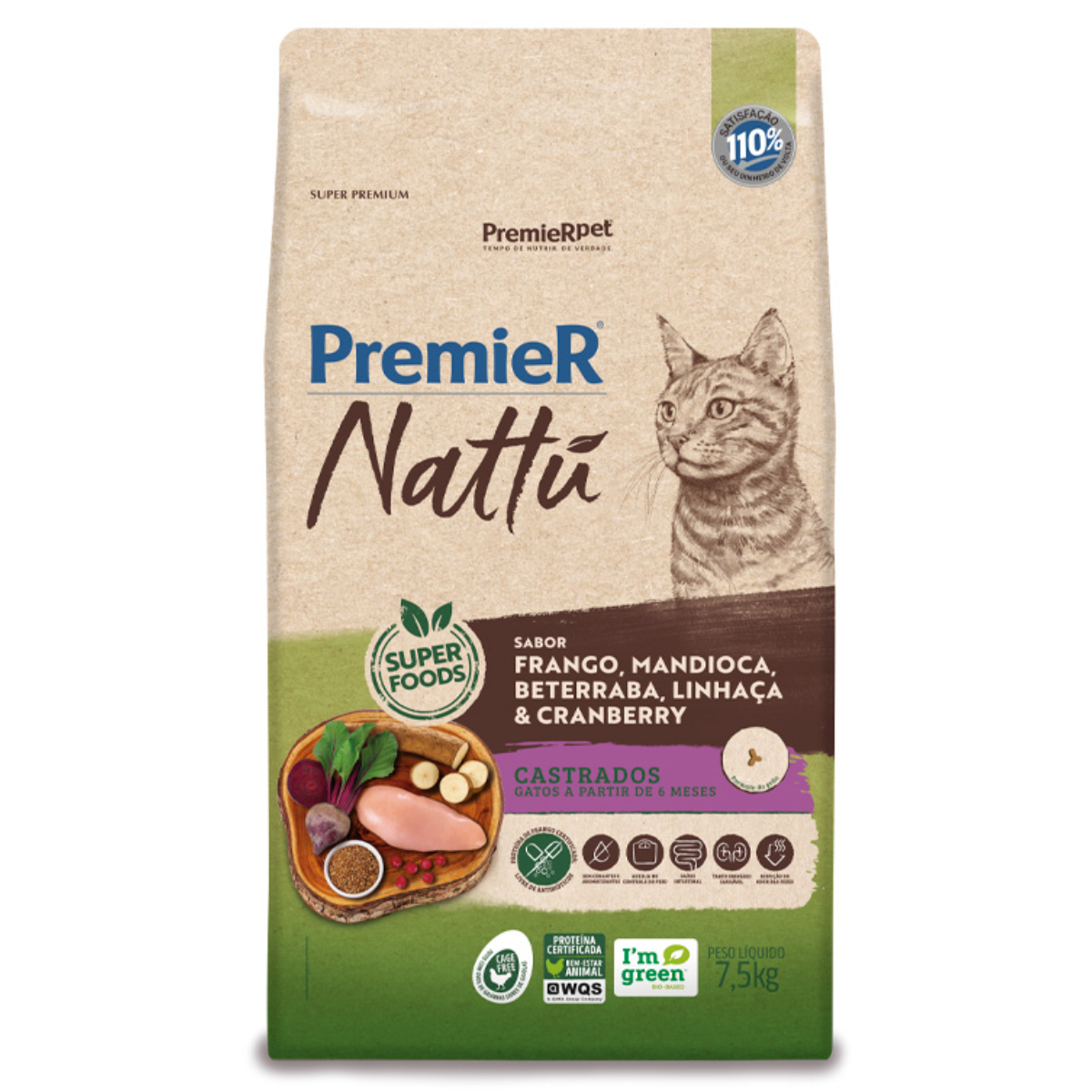 Ração PremieR Nattu para Gatos Castrados Sabor Frango, Mandioca, Beterraba, Linhaça & Cranberry 7,5Kg