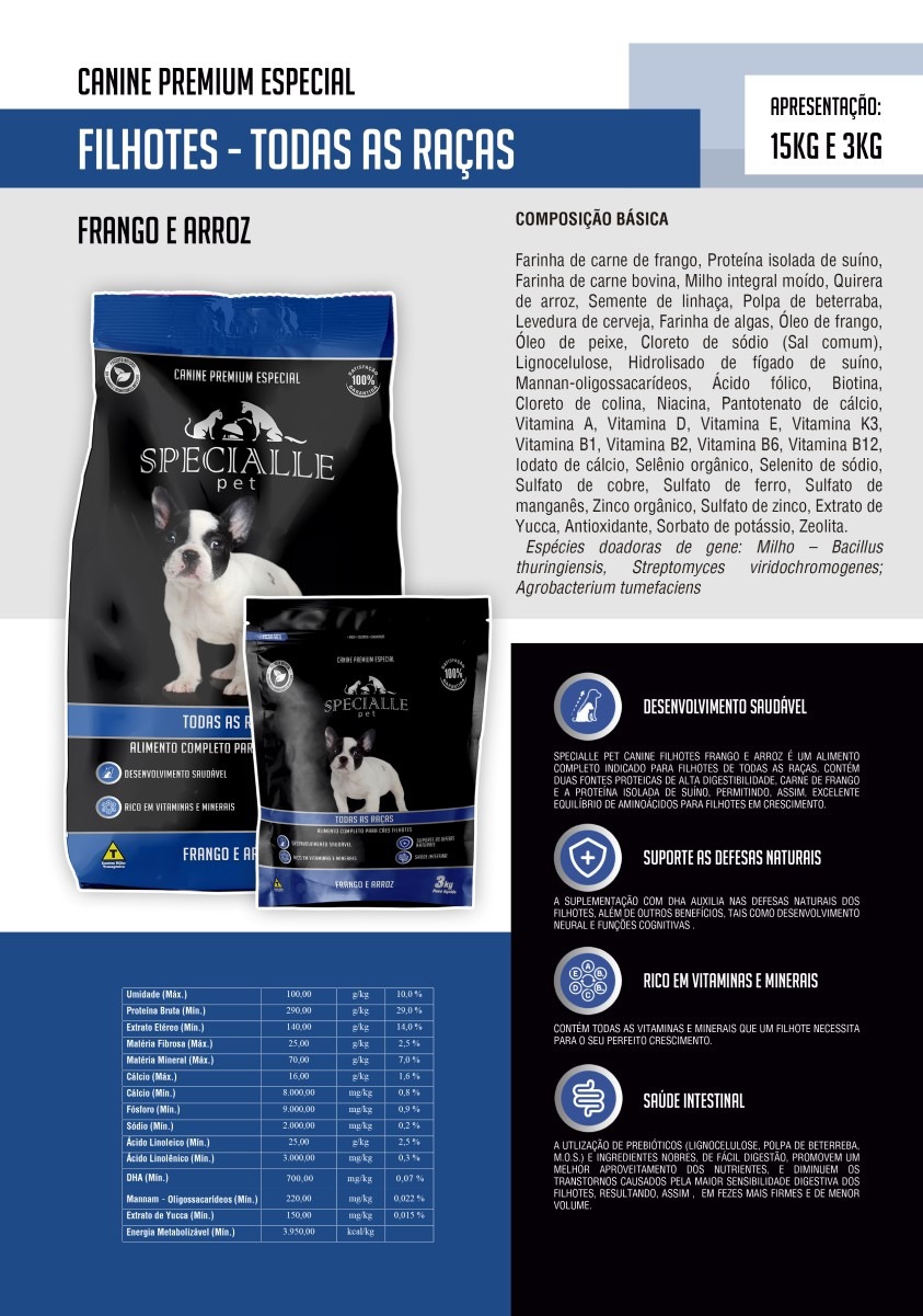 Specialle Pet Canine Filhotes Frango e Arroz é um alimento completo indicado para filhotes de todas as raças. Contém duas fontes proteicas de alta digestibilidade, carne de frango e a proteína isolada de suíno, permitindo, assim, excelente equilíbrio de aminoácidos para filhotes em crescimento.