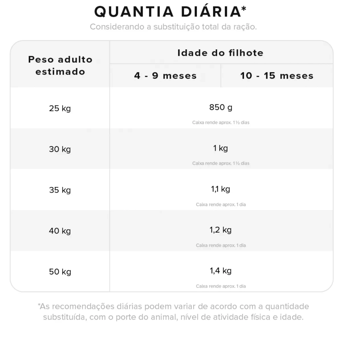 | Peso Adulto Estimado | 4 - 9 meses | 10 - 15 meses |