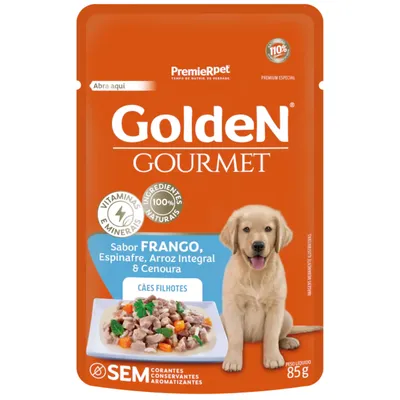 GoldeN® Gourmet Cães Filhotes Sabor Frango, Espinafre, Arroz Integral e Cenoura é um alimento Premium Especial que faz parte da linha GoldeN® Gourmet. Este produto é um alimento úmido completo indicado para cães filhotes desde o desmame até a idade adulta, pois promove o desenvolvimento excelente por meio do DHA e fontes de proteínas de excelente qualidade.