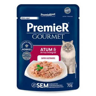 PremieR Gourmet Gatos Adultos Castrados – Atum e Arroz Integral é um alimento Super Premium que faz parte da linha PremieR Gourmet, uma linha de alimentos úmidos especialmente desenvolvida para retribuir todo amor e carinho que os gatos nos proporcionam. PremieR Gourmet Gatos Adultos Castrados Atum e Arroz Integral é nobre, nutritivo e natural, pois não contém corantes e aromatizantes artificiais, conservantes e nem ingredientes transgênicos.