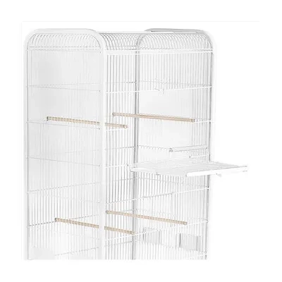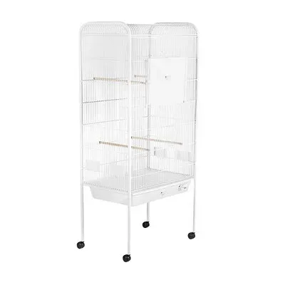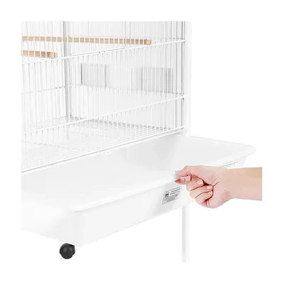 Arame, chapa com pintura epóxi, poleiro de madeira, tubo de metal e rodízio de plástico.